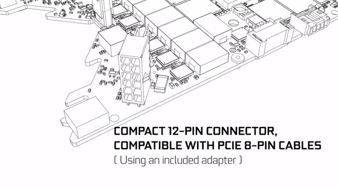No entanto, dois pontos se destacam durante o vídeo, e estão relacionados com a próxima linha da fabricante. O primeiro é o novo conector de 12 pinos que será utilizado para alimentar a família RTX 3000. A tecnologia já havia sido especulada no passado, e agora é enfim confirmada pela companhia, que reforça a compatibilidade da nova conexão com os conectores de 8 pinos, através de um adaptador incluído com as GPUs.